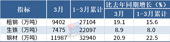 国家统计局数据显示:2021年3月我国粗钢日均产量303.3万吨,3月生铁日均产量241.1万吨,3月钢材日均产量386.7万吨。具体数据如下: