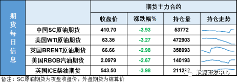 【1】WTI主力原油期货收跌-2.14美元,跌幅3.27%,报63.35美元/桶;布伦特主力原油期货收跌-2.05美元,跌幅2.98%,报66.66美元/桶;INE原油期货收跌3.93%,报410.7元。