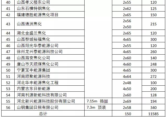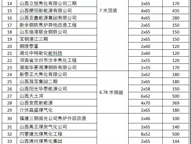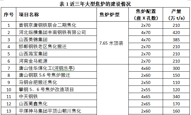 按照《产业结构调整指导目录》(2019年本)和《焦化行业规范条件》的要求,新建焦炉的顶装焦炉炭化室高度须≥6.0米,捣固焦炉炭化室高度须≥5.5米。近10年来,焦炉装置一直向大型化发展,下表为收集近三年的6米及以上的焦炉项目,供读者参考。