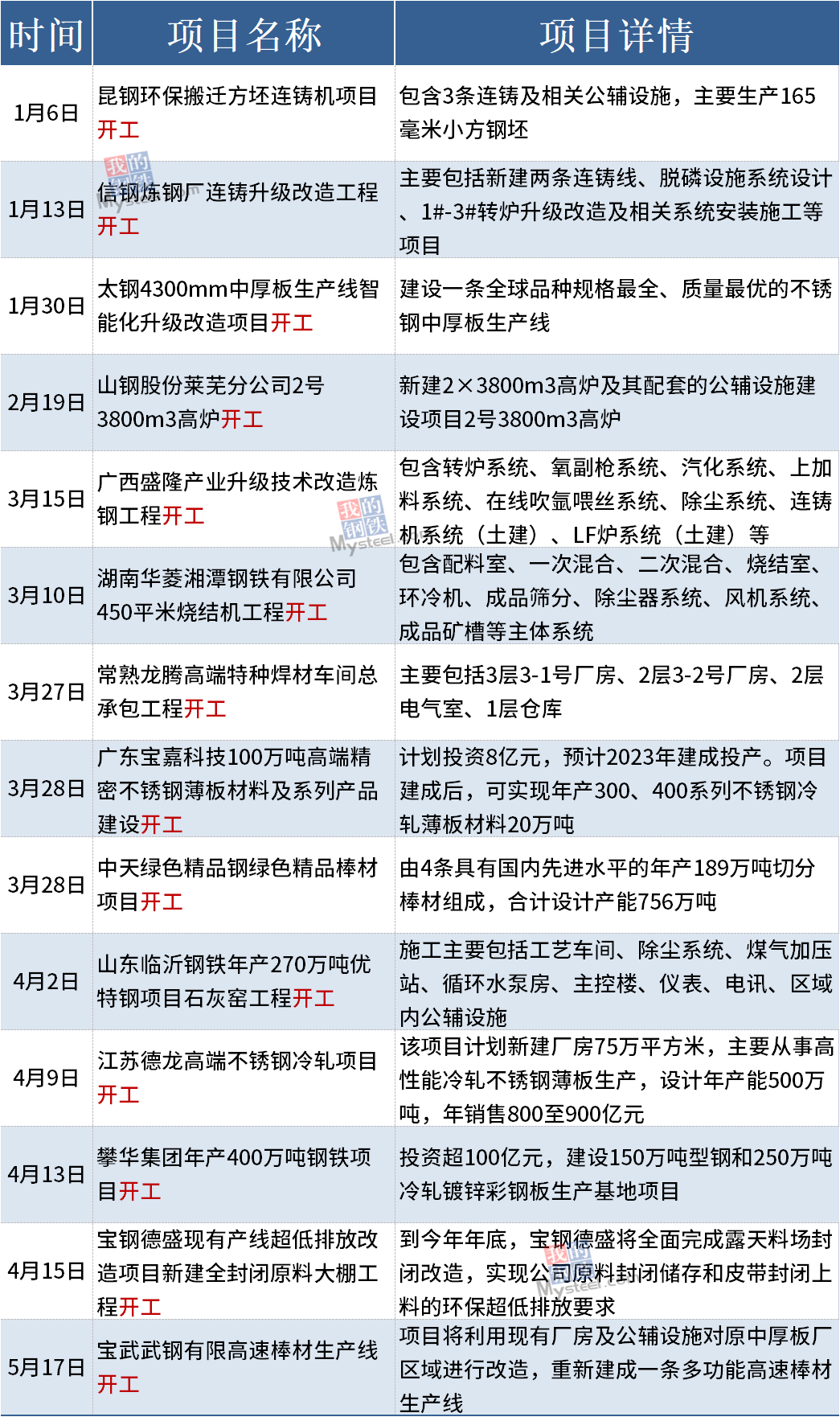 据Mysteel不完全整理,2021年1-5月有41个钢铁项目开工、投产或复产。其中,昆钢、信钢、太钢、临沂钢铁、和武钢等14家钢企相关项目开工;建龙西钢、涟钢、湛江钢铁、徐钢、广西柳钢和泰山钢铁等23个钢铁项目投产;西宁特钢、重庆钢铁和陕钢汉钢等4个钢铁项目复产,具体内容如下: