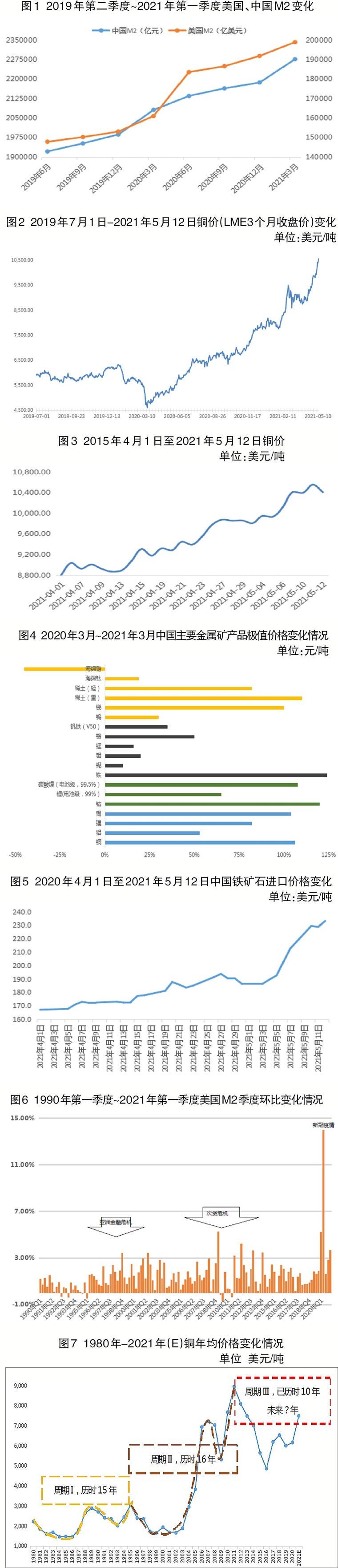 如图7所示,自1980年以来,铜价在41年的时间内,走出了3个明显的“W”周期。第一周期(1980年~1995年),历时16年,铜价由1460美元/吨上涨至3050美元/吨;第二周期(1996年~2011年),历时16年,铜价由1670美元/吨上涨至8950美元/吨;第三周期(2012年~2021年),已历时10年,铜价由4867美元/吨上涨至2021年(预计值,截至2021年5月12日)的8814美元/吨,仍低于2011年8950美元/吨的年均价。
