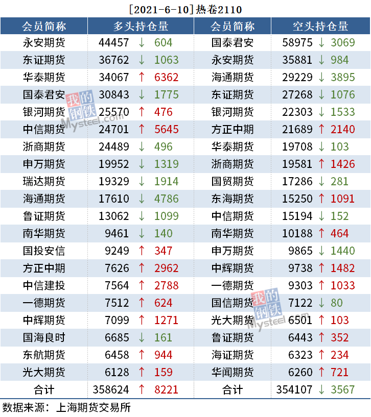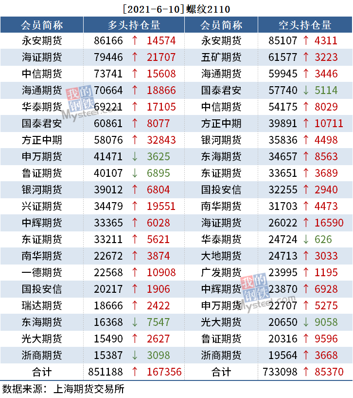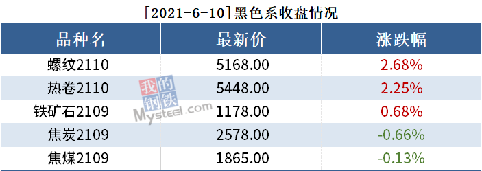 截至6月10日收盘,螺纹2110收5168,涨2.68%;热卷(5448, 120.00, 2.25%)2110收5448,涨2.25%;铁矿(1178, 8.00, 0.68%)石2109收1178,涨0.68%。
