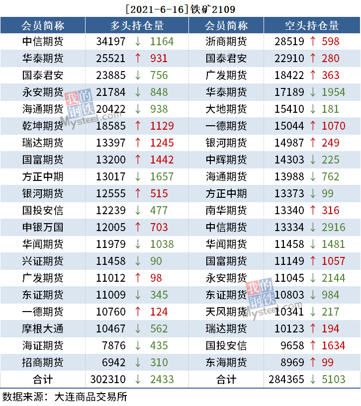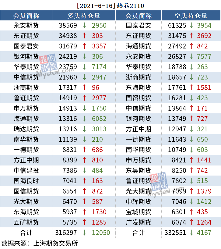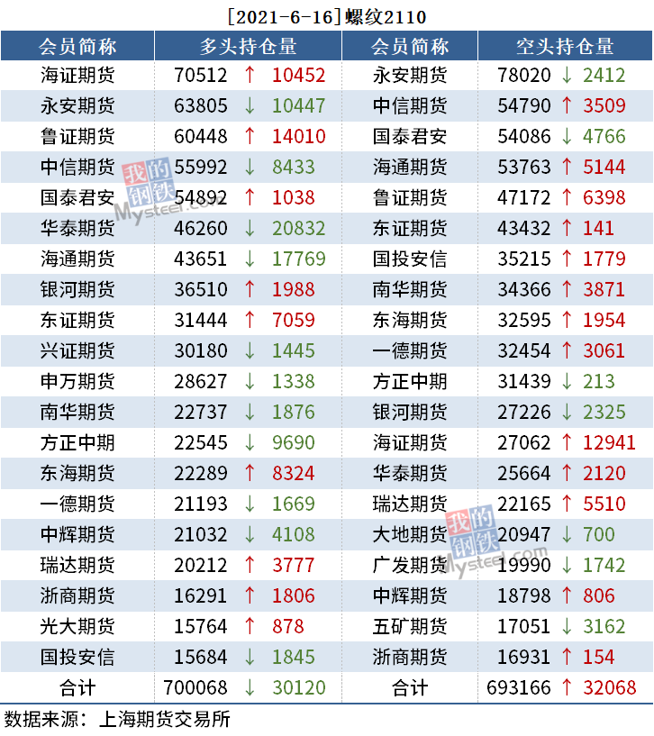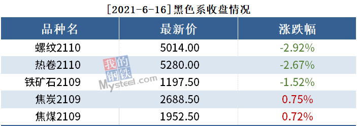 截至6月16日收盘,螺纹2110收5014,跌2.92%;热卷(5280, -145.00, -2.67%)2110收5280,跌2.67%;铁矿(1198, -18.50, -1.52%)石2109收1197.5,跌1.52%。