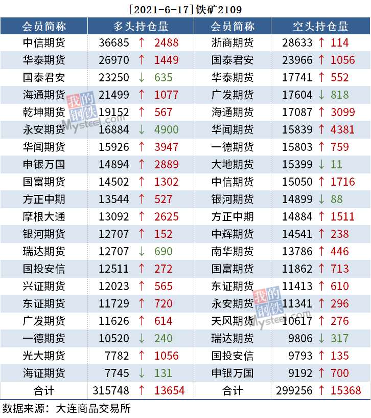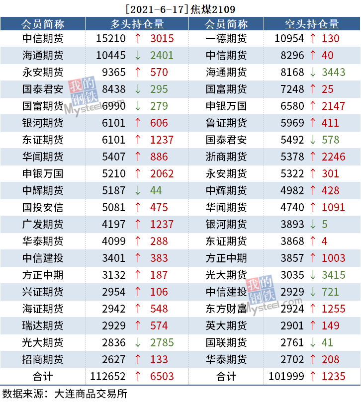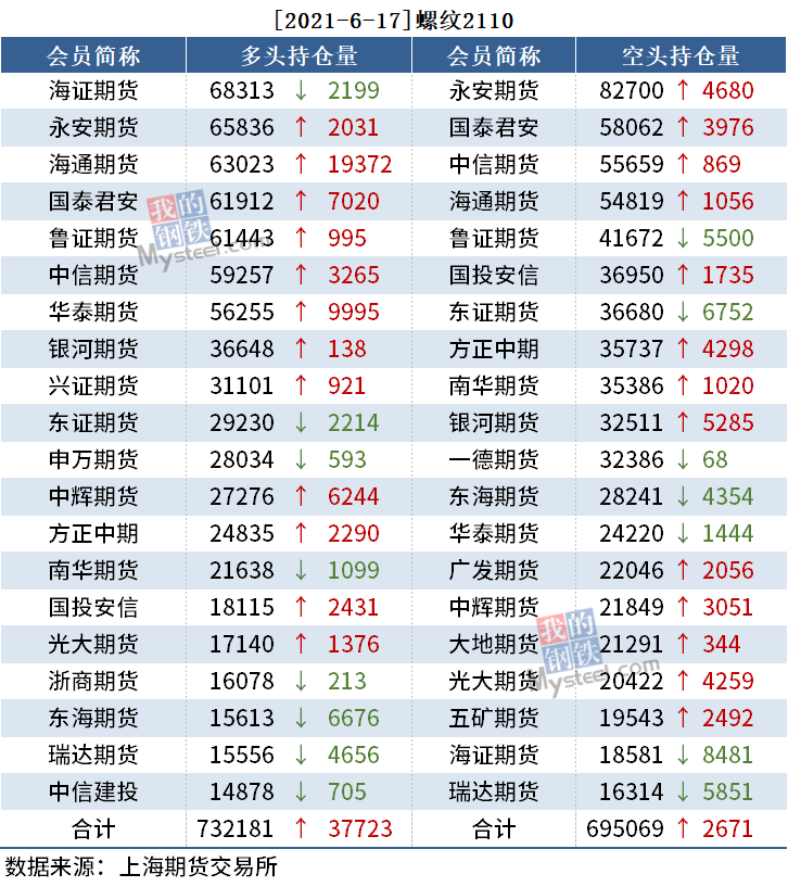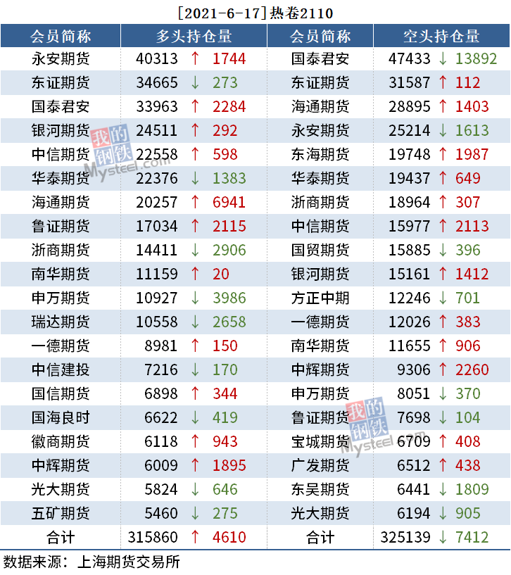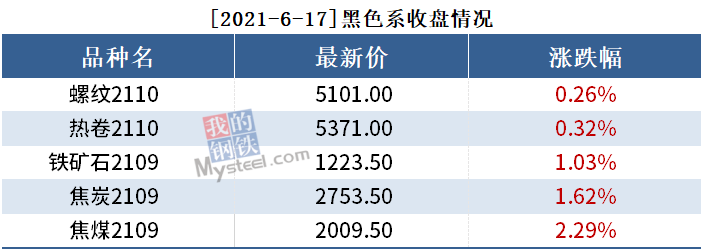 截至6月17日收盘,螺纹2110收5101,涨0.26%;热卷(5371, 17.00, 0.32%)2110收5371,涨0.32%;铁矿(1224, 12.50, 1.03%)石2109收1223.5,涨1.03%。