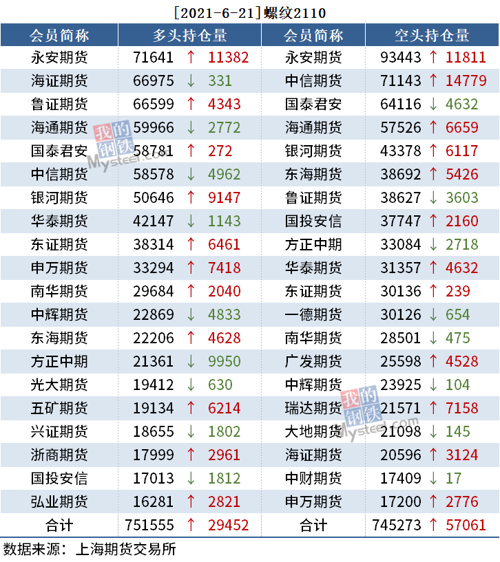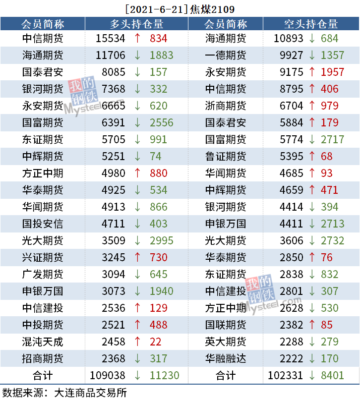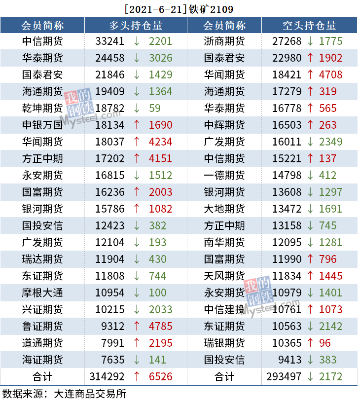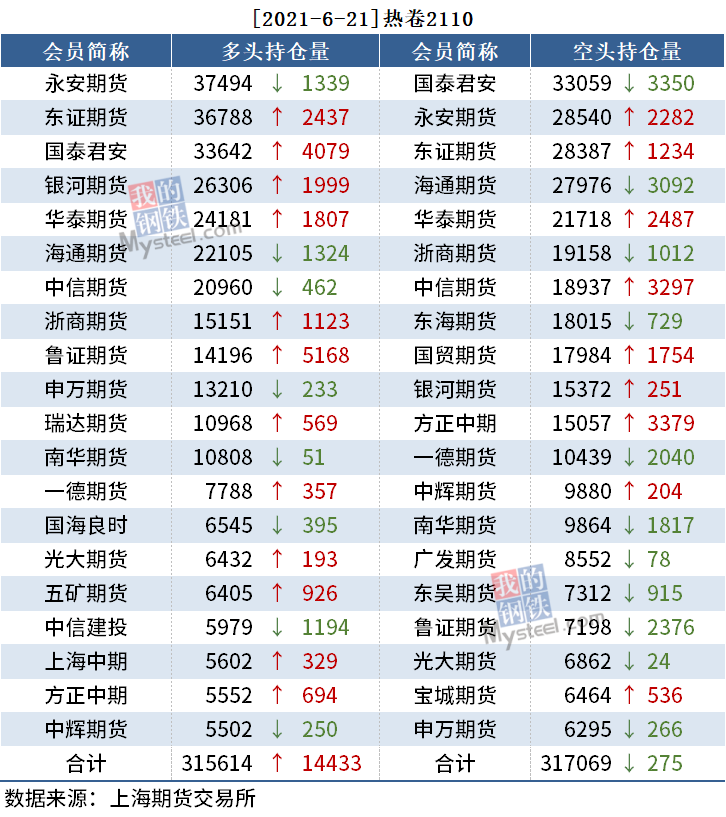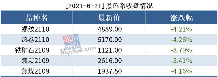 截至6月21日收盘,螺纹2110收4889,跌4.21%;热卷(5170, -230.00, -4.26%)2110收5170,跌4.26%;铁矿石2109收1121,跌8.79%。
