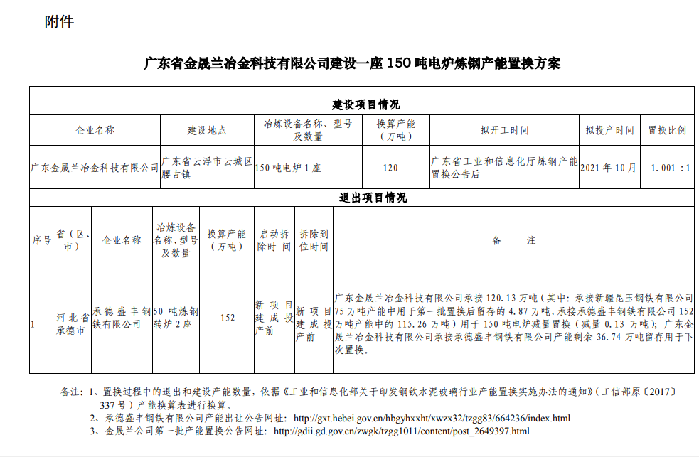 按照《国务院关于化解产能严重过剩矛盾的指导意见》(国发〔2013〕41号)、《国务院关于钢铁行业化解过剩产能实现脱困发展的意见》(国发〔2016〕6号)、《工业和信息化部关于印发钢铁行业产能置换实施办法的通知》(工信部原〔2021〕46号)和《工业和信息化部关于印发钢铁水泥玻璃(2629, -17.00, -0.64%)行业产能置换实施办法的通知》(工信部原〔2017〕337号)要求,经企业申请、云浮市工业和信息化主管部门初审、我厅审核并进行网上公示无异议,现将广东金晟兰冶金科技有限公司建设一座150吨电炉炼钢产能置换方案予以通告,欢迎社会公众进行监督。