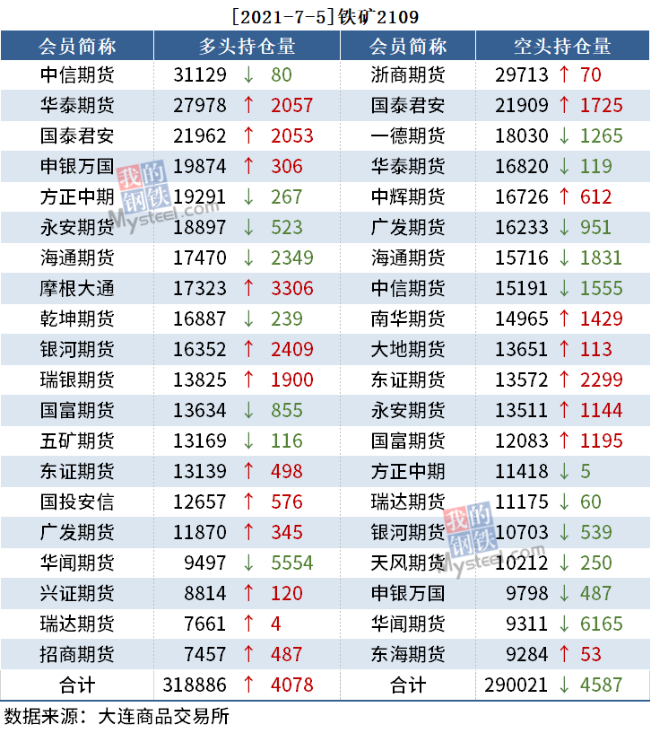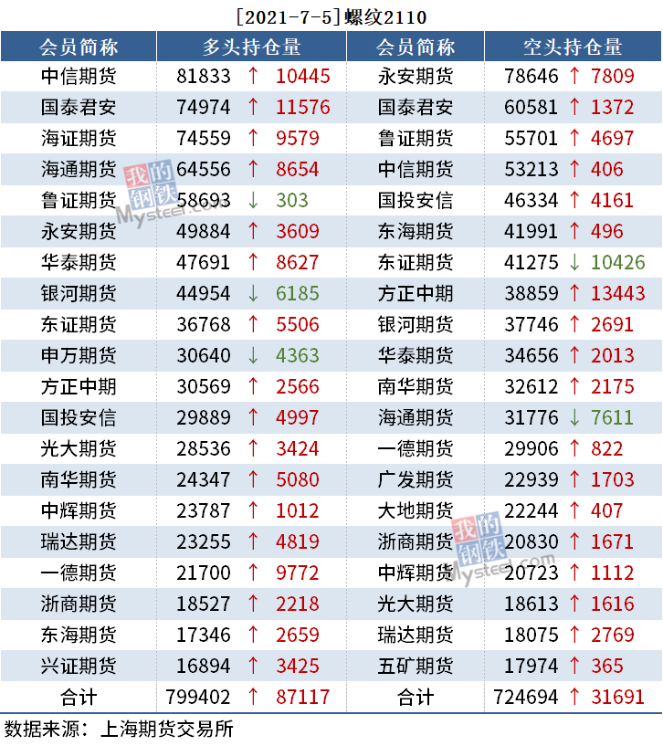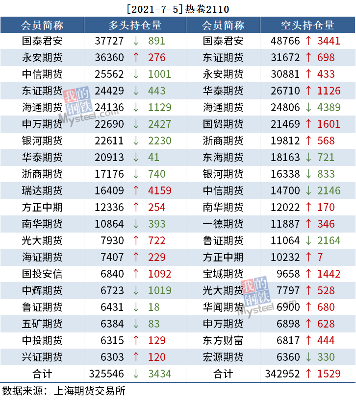 截至7月5日收盘,螺纹2110收5222,涨2.09%;热卷(5494, 86.00, 1.59%)2110收5494,涨1.59%;铁矿石2109收1225,涨5.51%。
