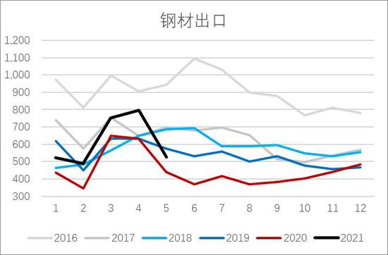 出口方面,2021年1-5月份我国出口钢材3092万吨,累计同比增592万吨。海外需求拉动了钢材出口量,而5.1开始,钢材取消出口退税政策已经落地。从国常会最新精神解读,日后极有可能进一步取消出口退税并增加出口征税。预计后面出口量在政策施压下会出现下滑。