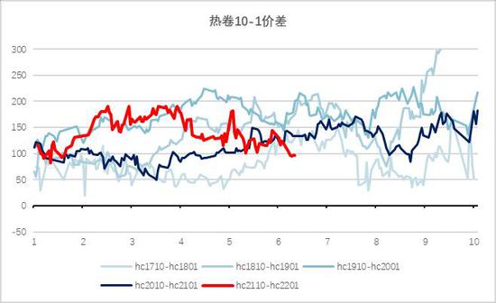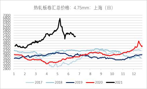 6月,螺纹主力合约RB2110大致在4800-5300区间震荡,自5月11日的高点6208元一路下跌至5月27日低点的4626元后,反弹震荡。热卷(5594, 166.00, 3.06%)hc2110合约,自11日最高点6208元,随后快速回落至25日收盘4919元。热卷主力合约HC2110从高点6727元下跌至低点的4951元后,同样反弹震荡,震荡区间5000-5600。热卷表现相比螺纹要更弱一些,主要原因还是热卷的产量高,同时限产放松后对热卷的承压相比螺纹更大。