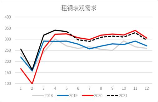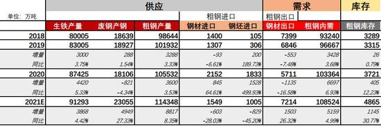 我们粗钢平衡表的粗钢产量口径使用Mysteel247家钢厂铁水产量样本以及富宝废钢日耗样本来作为基础数据测算。其中,由于mysteel的铁水产量口径明显偏小,我们自今年2月开始,对其进行修正(mysteel样子约占统计局口径的95%)。我们从产量、进出口和库存表观推算2020年国内粗钢需求累计同比增速为6.9%。对于2021年的整体需求表现,相比上次月报给出的需求预测,我们根据宏观数据表征的实际需求,微微下修了需求预期,我们预计2021年7-12月的内需同比2020年下半年增速在-3%。全年增幅在5%左右。