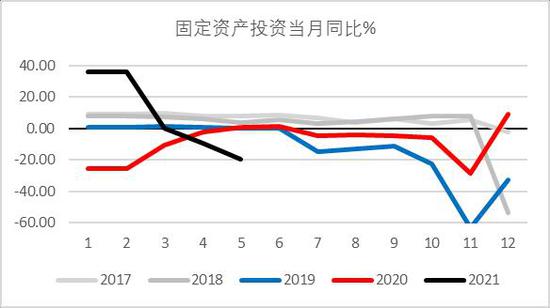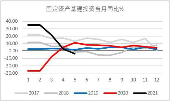5月,固定资产基建投资当月同比增速为-3.64%,当月增速首次为负;固定资产投资当月同比增速为-19.65%。