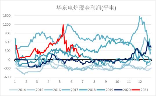 5月后,由于暴涨的钢厂利润,使非限产地以及电炉产量增长迅速,产量甚至超过了唐山限产前的水平。而需求在4月宏观数据发布后也再次证实并没有想像中的坚挺。叠加5月初钢材取消出口征税、国常会保供的精神,市场开始限产放松的预期。于是,钢材上涨的两大驱动(限产+海外高价需求拉动)都开始弱化,钢材快速回落。