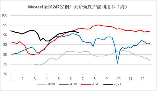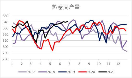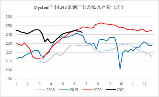 铁水端:近期市场限产停产消息频繁,尤其继国常会三次发声“大宗涨价”之后,市场对于限产的预期摇摆不定。最近又临近七一我党生日,各地陆续开始焖炉限产,时间为6月29日至7月一日三天。此时,正值各地钢厂长流程亏损,虽然亏损不高,但钢厂正好借此时间开始检修,预计限产检修时间可能较预期要长一些。6月至目前,mysteel247家日均铁水产量预计在243万吨左右,预计统计局口径在253-255万吨左右。对于下半年产量,暂时仍以“同比去年下半年持平”为预期来推演,日均铁水产量在249-250万吨左右。