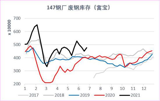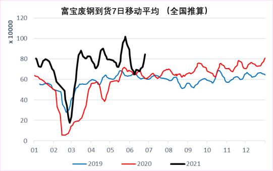 另一方面,从废钢供应端看,今年废钢的供应来源主要还是社会折旧废钢+加工废钢+自产废钢。废钢进口虽然已经放开,但1-4月的废钢进口量依然很少,据海关数据显示,我国1-4月累计进口废钢13.16万吨。然后,全年废钢增量将体现在废钢到货上,可以参见图20,1-6月累计到现在全年日均废钢到货量增加有26万吨左右。假设7-12月到货增量日均增10万吨,这样全年的废钢增量大概在6500万吨左右(26*181+10*184)。