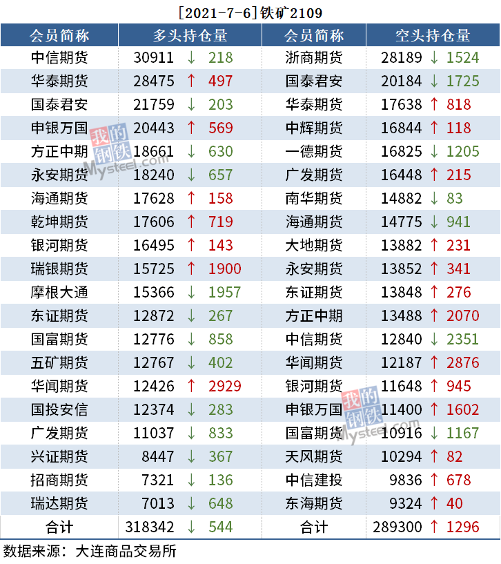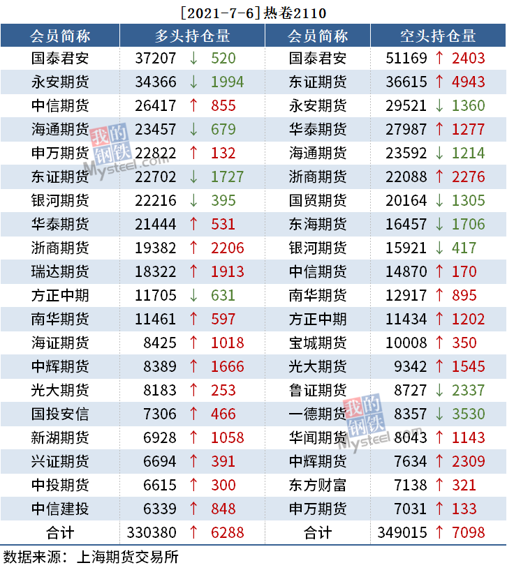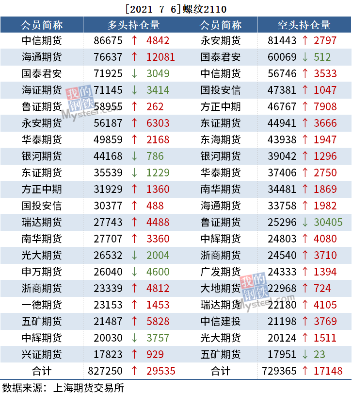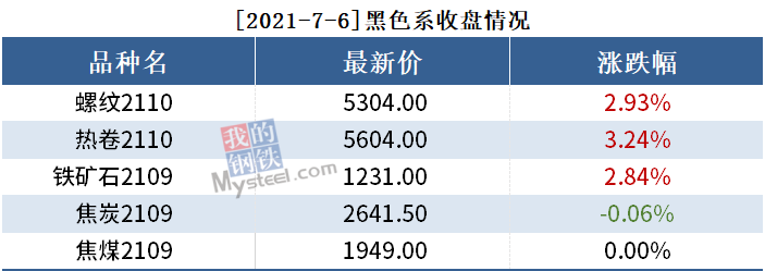 截至7月6日收盘,螺纹2110收5304,涨2.93%;热卷(5604, 176.00, 3.24%)2110收5604,涨3.24%;铁矿(1231, 34.00, 2.84%)石2109收1231,涨2.84%。