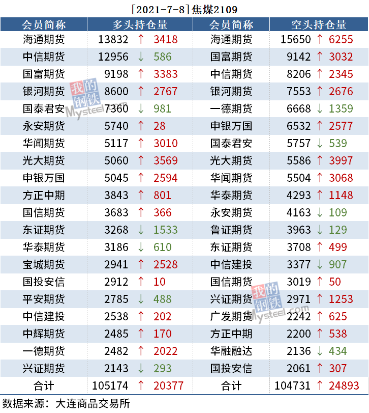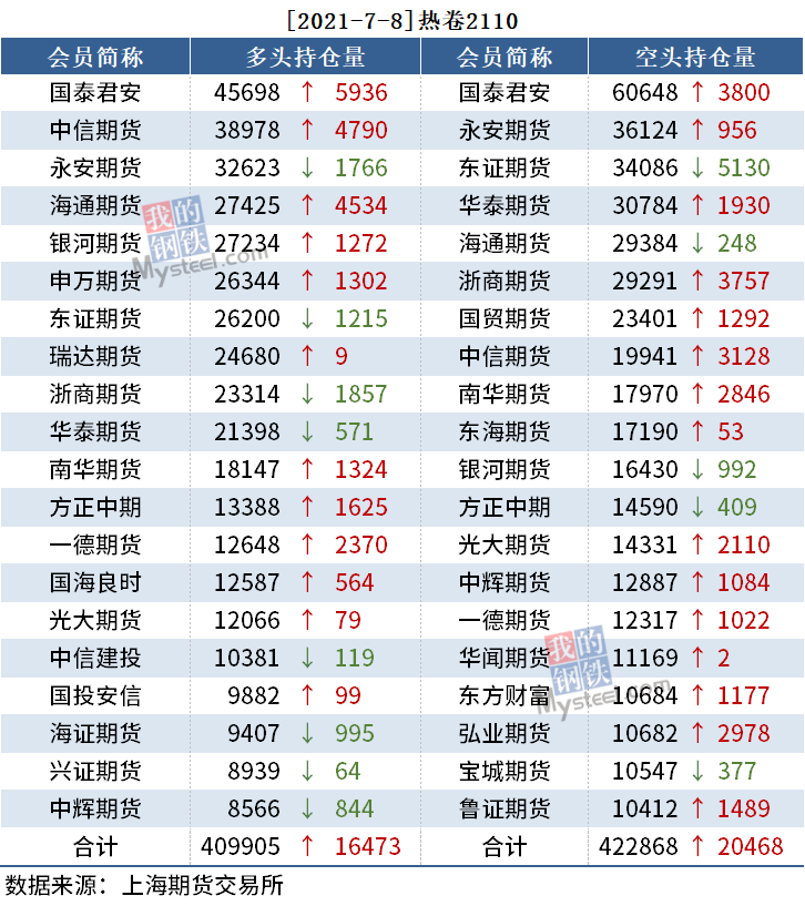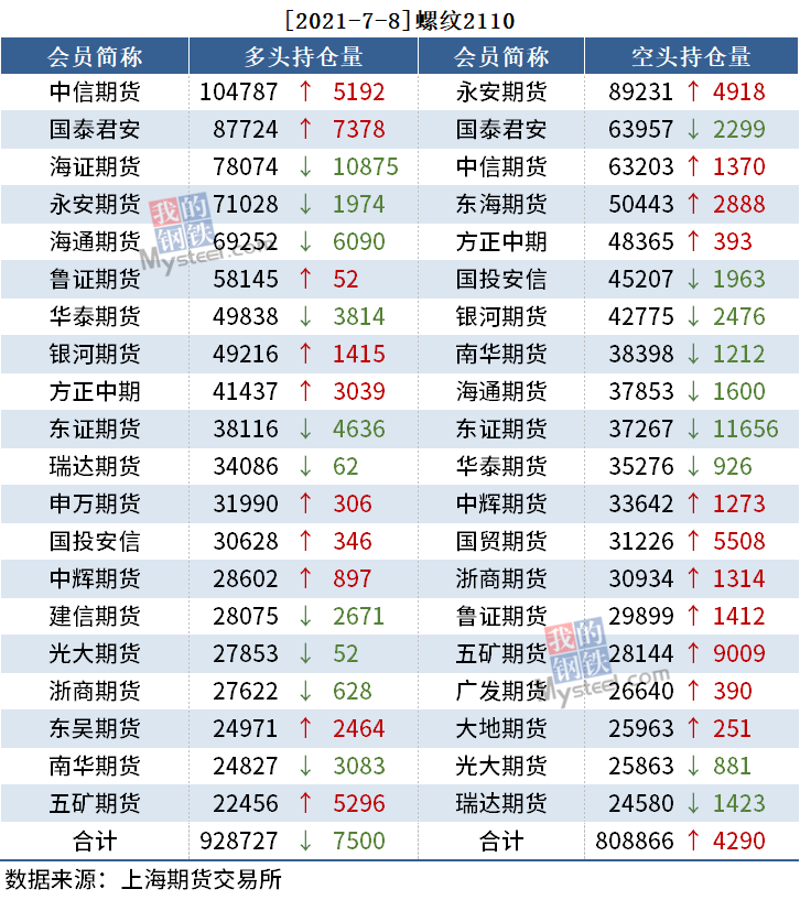 截至7月8日收盘,螺纹2110收5393,涨0.99%;热卷(5750, 81.00, 1.43%)2110收5750,涨1.43%;铁矿石2109收1187.5,跌2.94%。