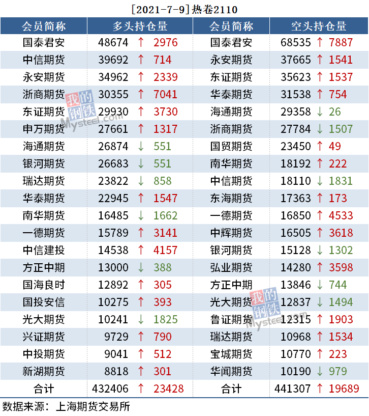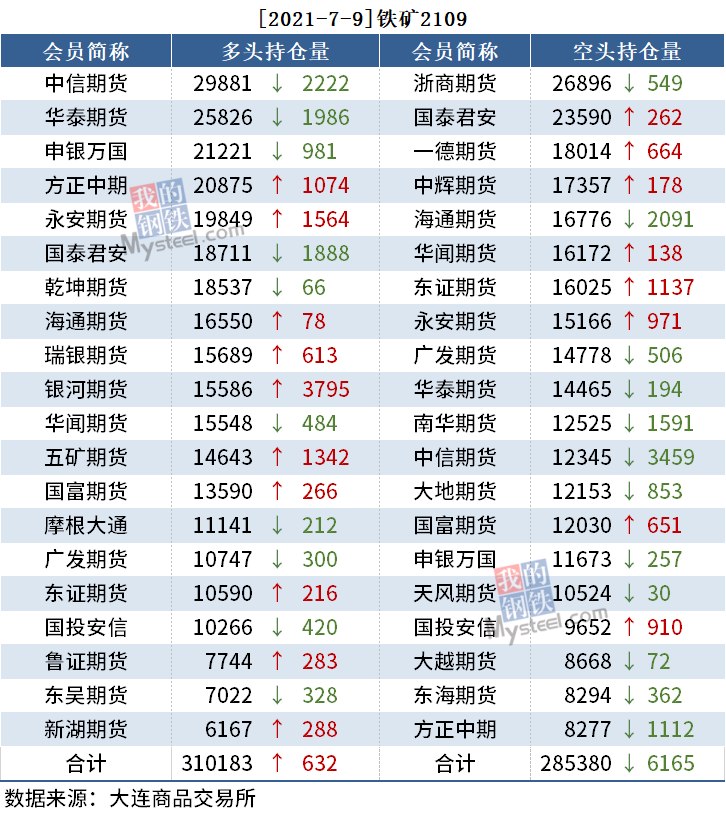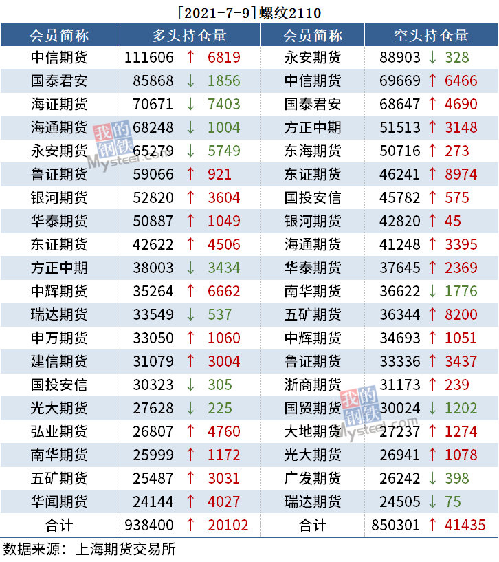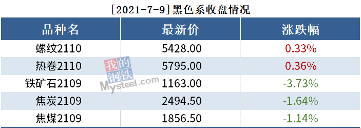 截至7月9日收盘,螺纹2110收5428,涨0.33%;热卷(5795, 21.00, 0.36%)2110收5795,涨0.36%;铁矿石2109收1163,跌3.73%。