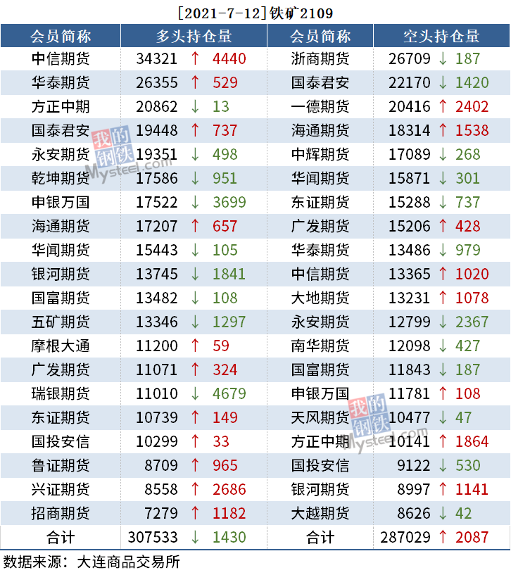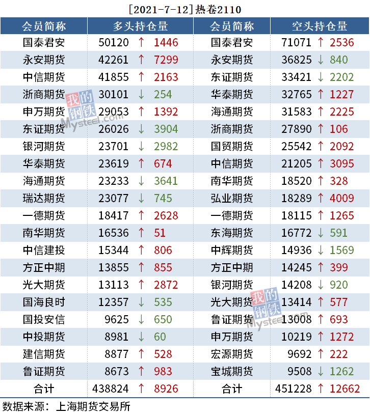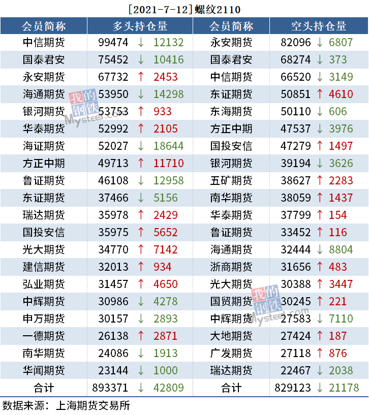 截至7月12日收盘,螺纹2110收5432,涨1.42%;热卷(5828, 83.00, 1.44%)2110收5828,涨1.44%;铁矿(1189, 17.00, 1.45%)石2109收1188.5,涨1.45%。