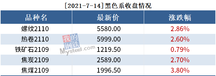 截至7月14日收盘,螺纹2110收5580,涨2.86%;热卷(5999, 152.00, 2.60%)2110收5999,涨2.6%;铁矿(1220, 9.50, 0.79%)石2109收1219.5,涨0.79%。