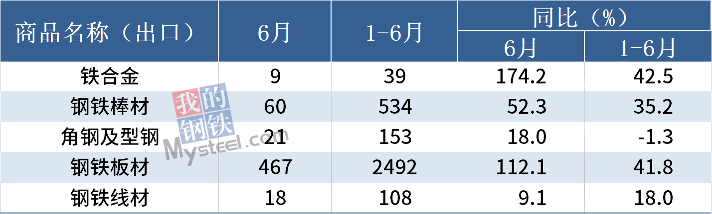6月,我国出口钢铁棒材60万吨,同比增长52.3%;1-6月累计出口534万吨,同比增长35.2%。其他出口情况如下表所示: