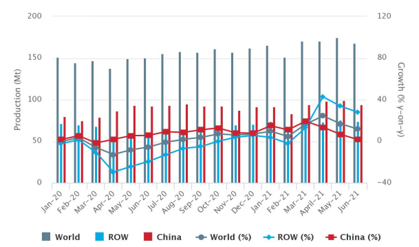 注:左轴:产量,百万吨;右轴:同比增幅,%;下标:全球、除中国外、中国、世界(%)除中国外(%)、中国(%)