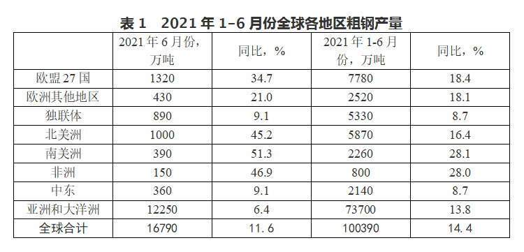 2021年1-6月份,全球粗钢产量为10.039亿吨,同比增长14.4%。其中,亚洲和大洋洲合计粗钢产量为7.37亿吨,同比增长13.8%;欧盟生产粗钢7780万吨,同比增长18.4%;北美洲粗钢产量为5870万吨,同比增长16.4%;南美洲粗钢产量为2260万吨,同比增长28.1%;独联体地区粗钢产量为5330万吨,同比增长8.7%;非洲粗钢产量为800万吨,同比增长28.0%。