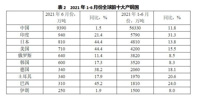 6月份,亚洲和大洋洲合计生产粗钢1.225亿吨,同比增长6.4%。其中,中国粗钢产量为9388万吨,同比增长1.5%;印度粗钢产量为940万吨,同比大幅增长21.4%;日本粗钢产量为810万吨,同比增长44.4%;韩国粗钢产量为600万吨,同比增长17.3%。