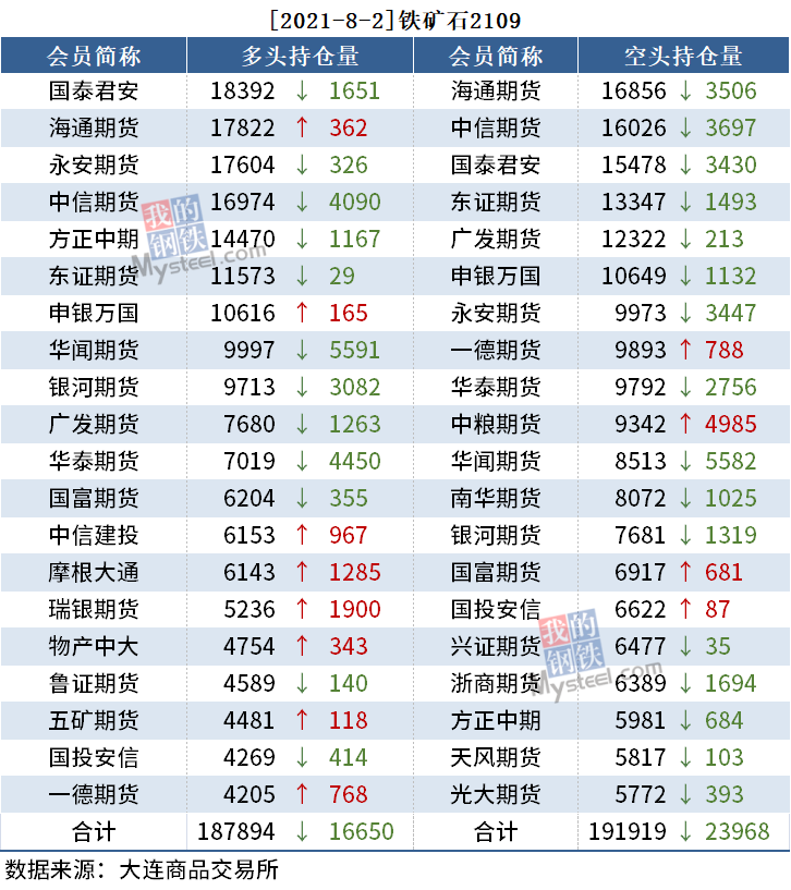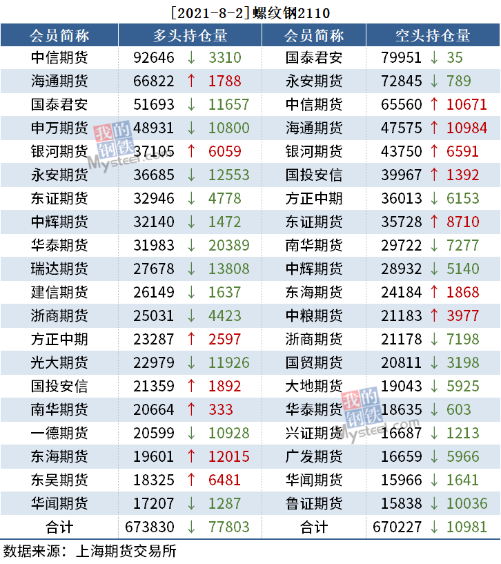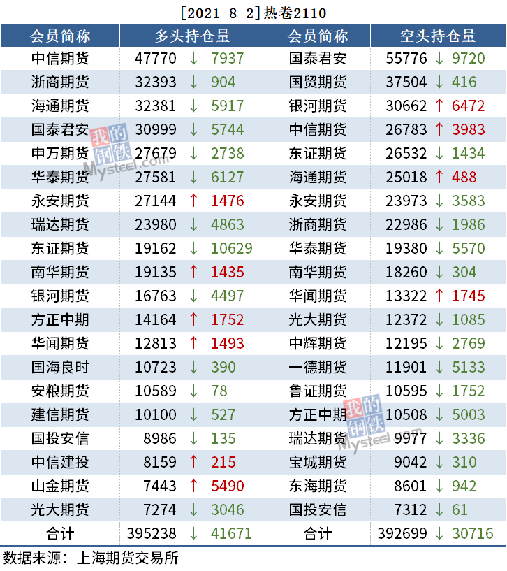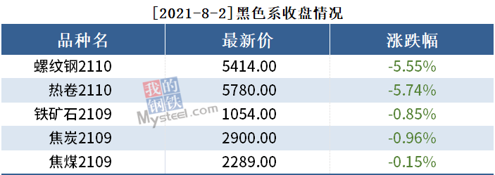 截至8月2日收盘,螺纹钢(5414, -318.00, -5.55%)2110收5414,跌5.55%;热卷(5780, -352.00, -5.74%)2110收5780,跌5.74%;铁矿(1054, -9.00, -0.85%)石2109收1054,跌0.85%。