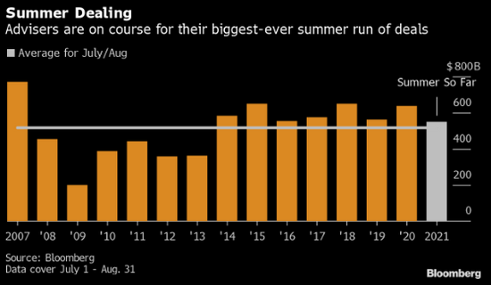 彭博数据显示,自7月开始以来已有近5500亿的交易获宣,而且过去24小时里还传出一系列并购消息,这表明在8月份结束前会创下纪录。