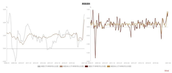 美国6月CPI通胀创2008年以来新高,连续第三个月超出市场预期。具体数据来看,美国6月CPI环比升0.9%,创2008年6月以来新高,预期升0.5%;CPI同比升5.4%,续创2008年8月以来新高,预期升4.9%。核心CPI环比上涨0.9%,同比则上升4.5%,创1991年11月以来最大涨幅。细分项来看,6月CPI走强主要受到了交通运输和能源等分项的影响。由于汽车市场持续火爆,交通运输当月环比增长3.6%。针对不断上行的物价,美联储主席鲍威尔坚持认为通胀上升是暂时的,随着情况恢复正常,通胀增速会放缓。