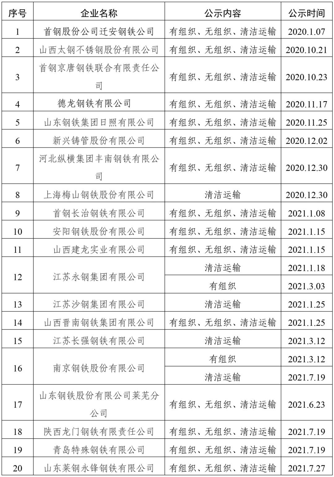 自2020年8月起,中国钢铁工业协会开展了钢铁企业超低排放改造和评估监测进展情况公示工作。截至目前,已有20家企业在钢协网站进行公示。已公示企业名单汇总及各企业公示内容整理如下: