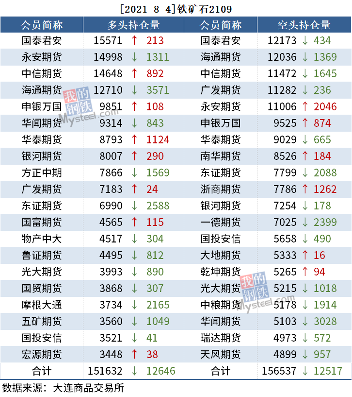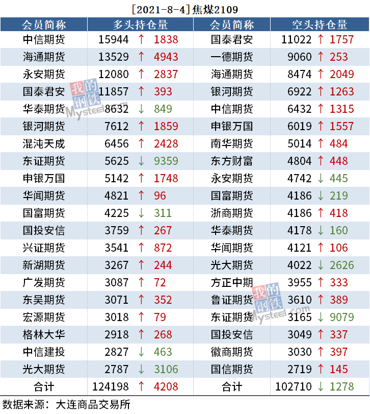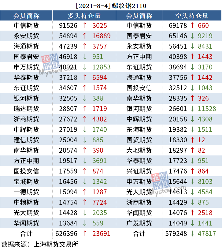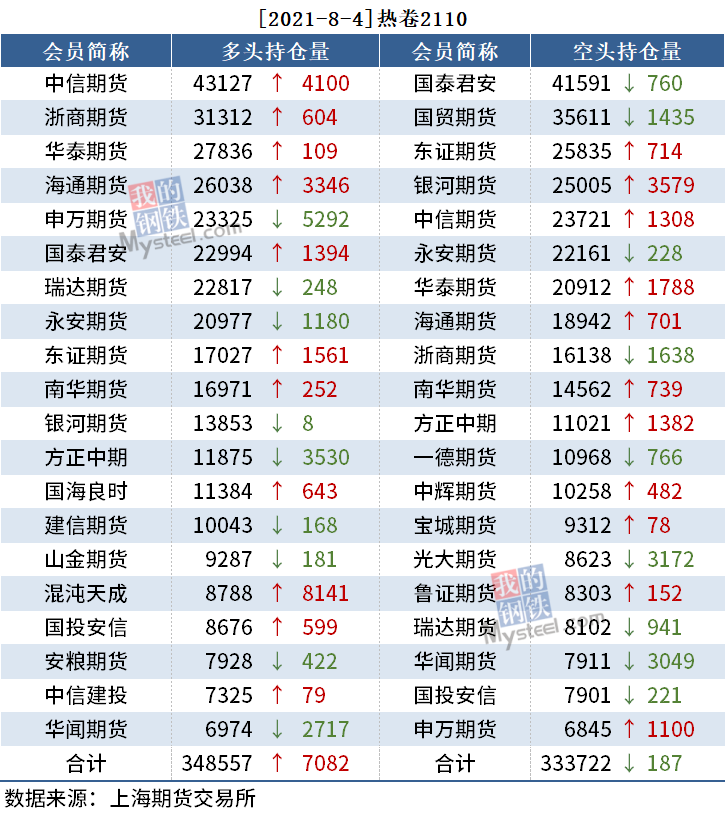 截至8月4日收盘,螺纹钢(5454, 131.00, 2.46%)2110收5454,涨2.46%;热卷(5853, 156.00, 2.74%)2110收5853,涨2.74%;铁矿(1067, 5.50, 0.52%)石2109收1067,涨0.52%。