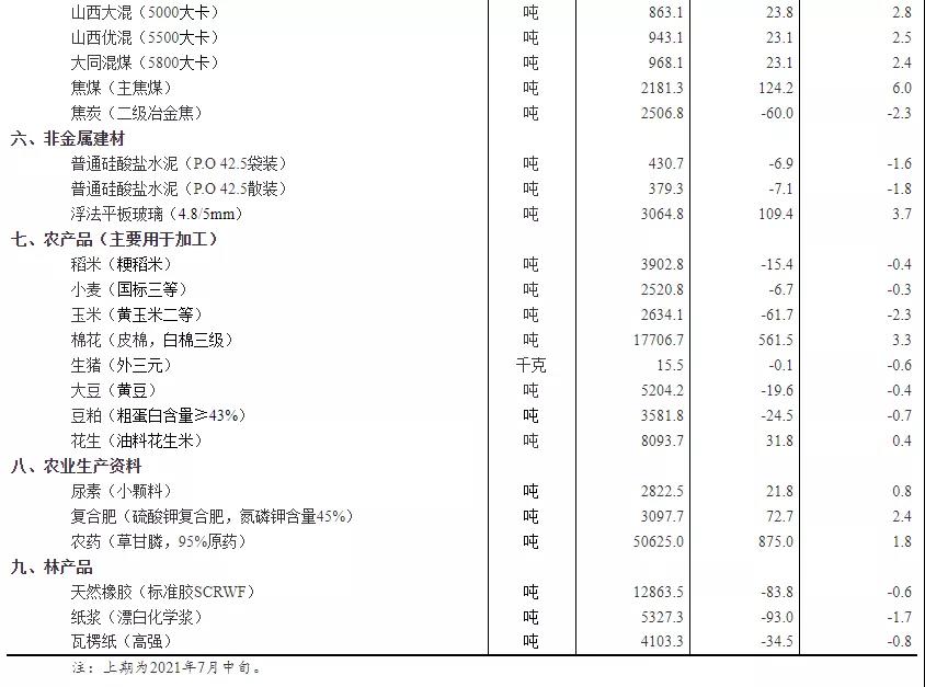 2021年7月下旬流通领域重要生产资料市场价格变动情况