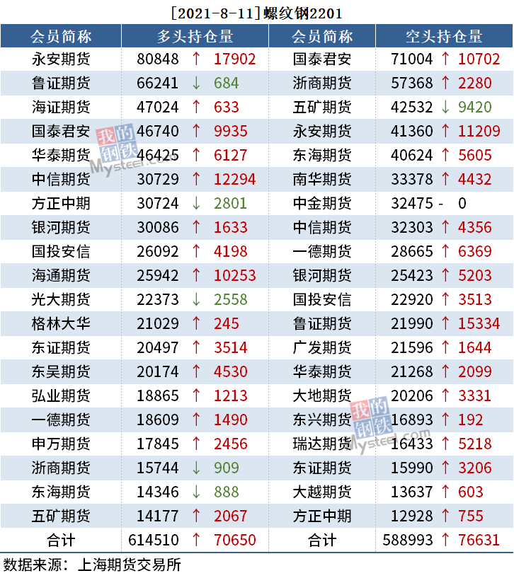 截至8月11日收盘,螺纹钢(5597, 171.00, 3.15%)2201收5597,涨3.15%;热卷(5901, 96.00, 1.65%)2110收5901,涨1.65%;铁矿(872, 31.00, 3.69%)石2201收871.5,涨3.69%。