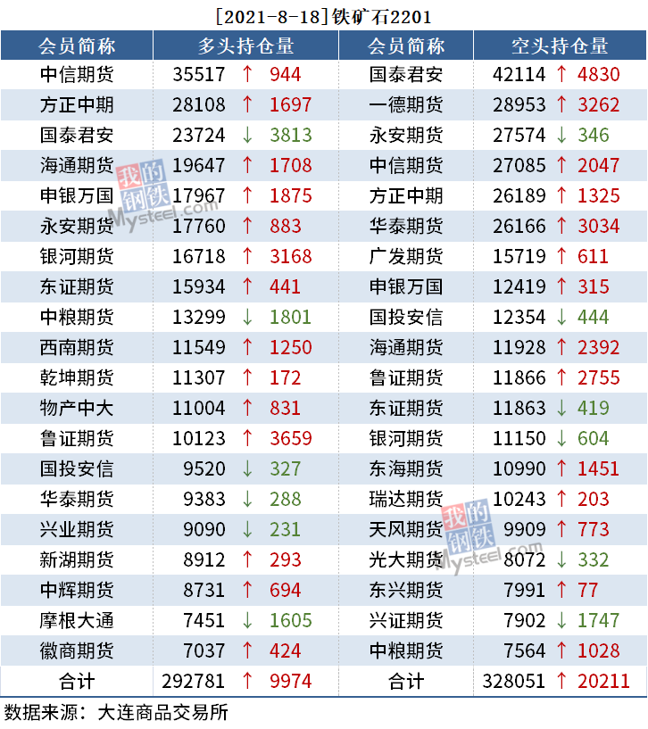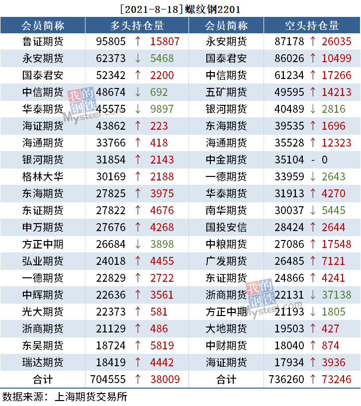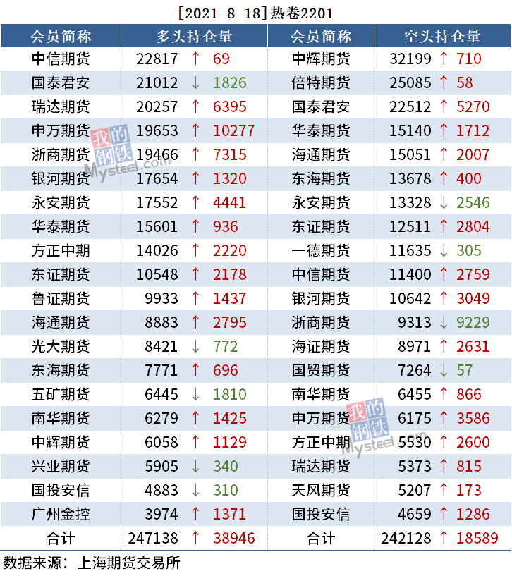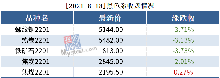 截至8月18日收盘,螺纹钢(5144, -198.00, -3.71%)2201收5144,跌3.71%;热卷(5482, -177.00, -3.13%)2201收5482,跌3.13%;铁矿(813, -31.50, -3.73%)石2201收813,跌3.73%。