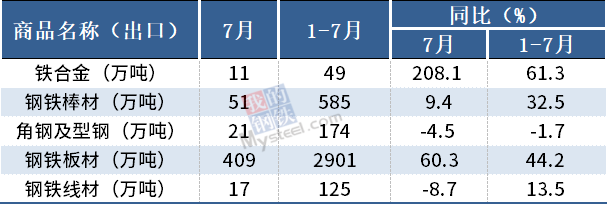 7月,我国出口钢铁棒材51万吨,同比增长9.4%;1-7月累计出口585万吨,同比增长32.5%。其他出口情况如下表所示: