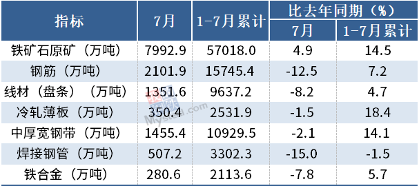 7月份,我国铁矿(763, -59.00, -7.18%)石原矿产量为7992.9万吨,同比增长4.9%;1-7月累计产量为57018.0万吨,同比增长14.5%。