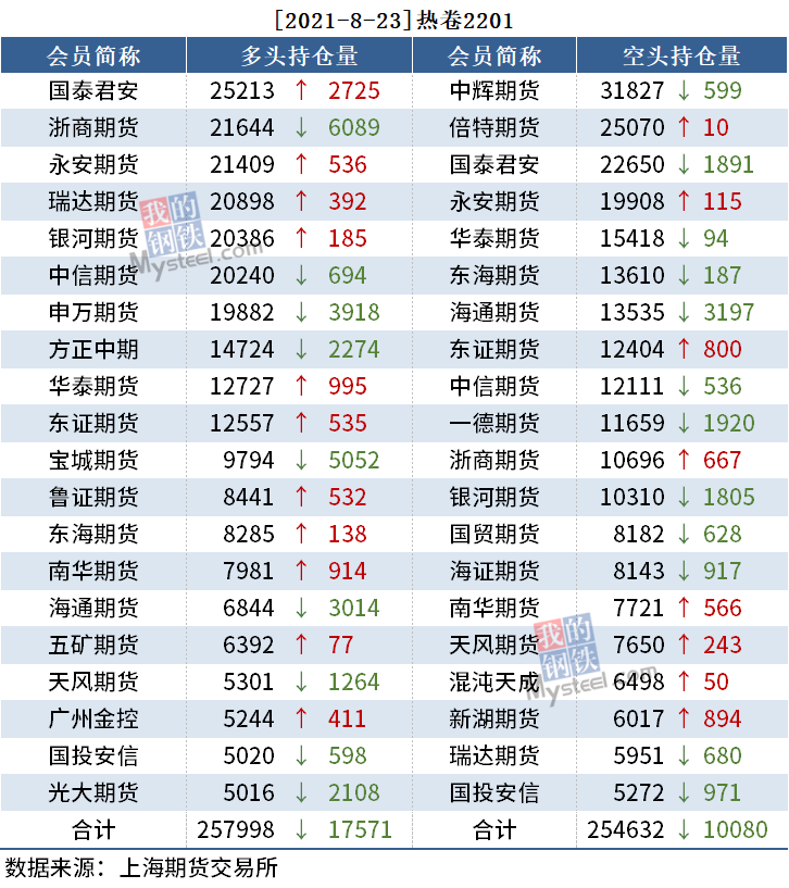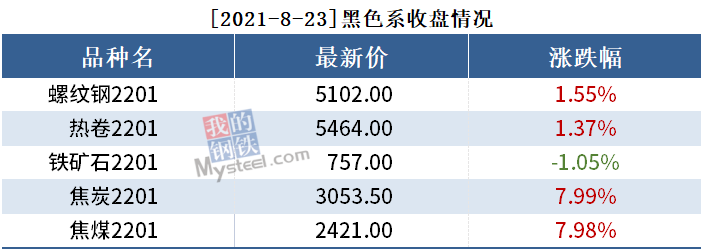 截至8月23日收盘,螺纹钢2201收5102,涨1.55%;热卷2201收5464,涨1.37%;铁矿石2201收757,跌1.05%。