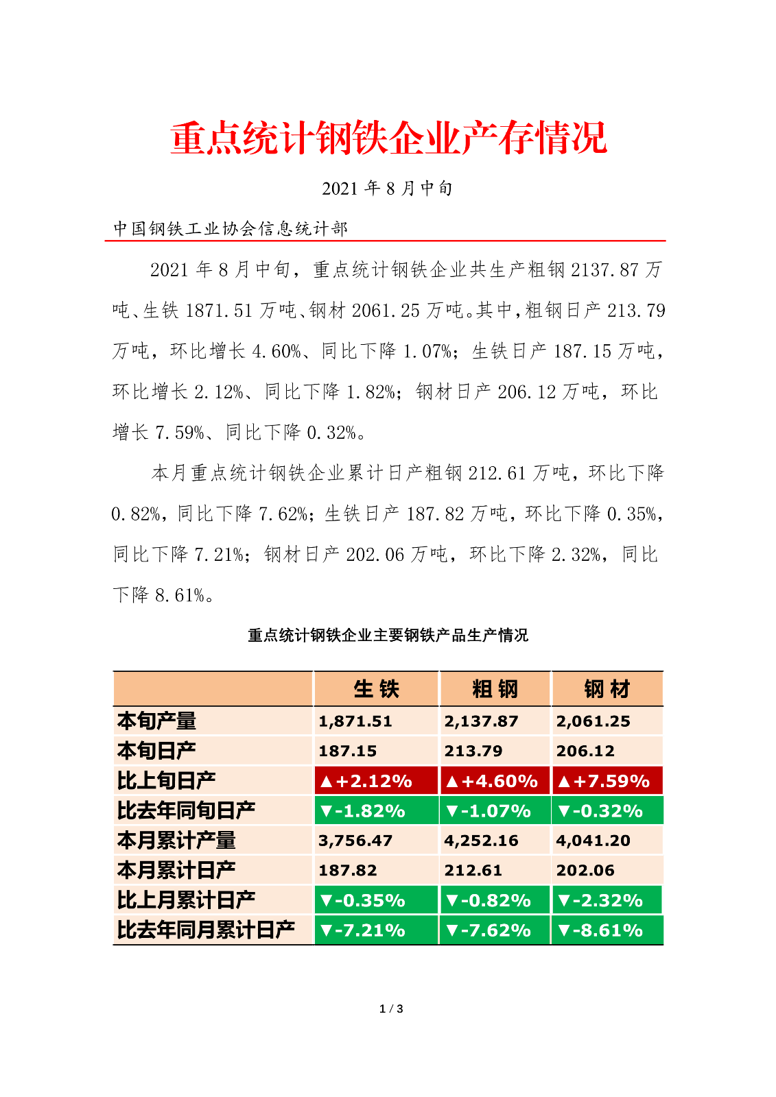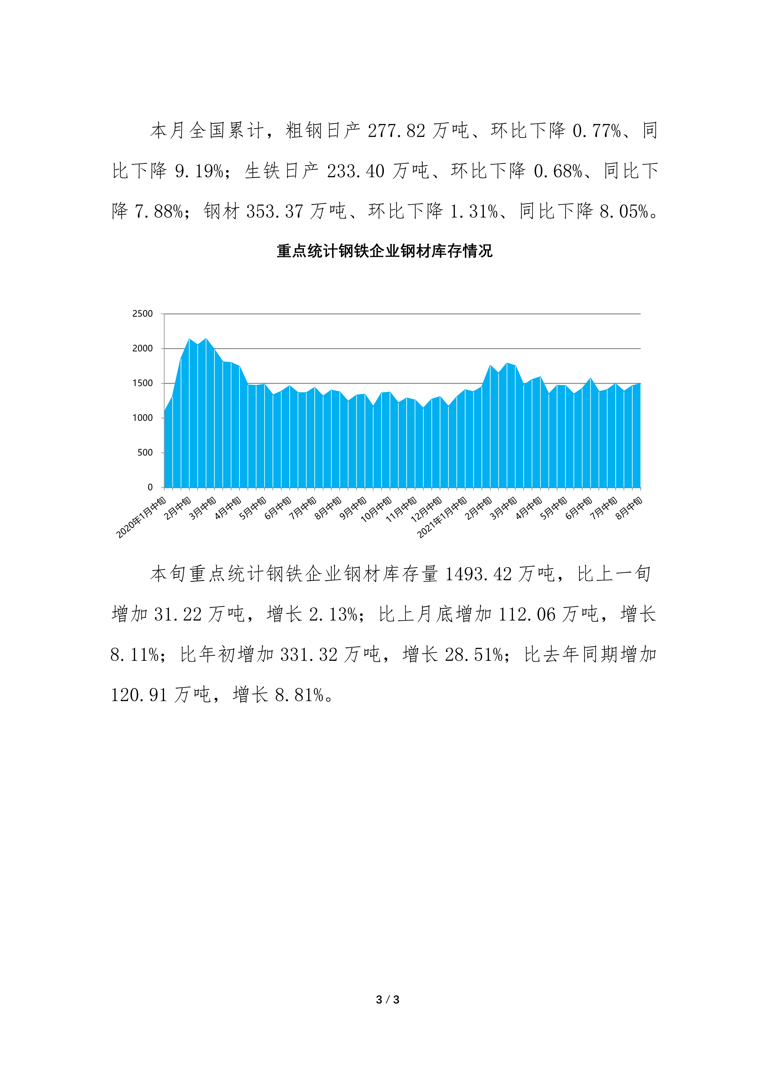 据中钢协最新数据显示,8月中旬,重点钢企粗钢日均产量213.79万吨,环比增长4.60%、同比下降1.07%;钢材库存量1493.42万吨,比上一旬增加31.22万吨,增长2.13%。