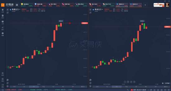 周四早盘,焦煤(2669, 197.50, 7.99%)、焦炭(3393, 239.00, 7.58%)主力合约开盘涨超2%,10:50,焦煤主力合约涨停,报2669元/吨。11:00,焦炭主力合约涨停,报3406元/吨,动力煤(919, 38.40, 4.36%)涨超5%。