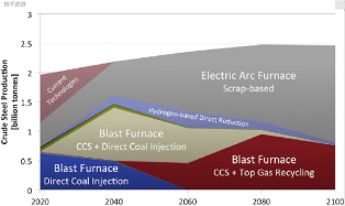 第一阶段(2020年~2040年):以煤炭为主的高炉炼钢工艺产能明显萎缩,以添加CCS装置的高炉炼钢工艺尚有一定产能,以基于废钢的电炉炼钢工艺产能明显上升;