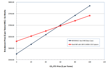 根据《巴黎协定》的相关碳减排目标,钢铁行业碳排放需求依然很大。随着需求的增加,政策的收紧,碳价格将进一步水涨船高。图中所示,当碳价格达到60美元时,对高炉炼钢工艺改进后的炼钢成本与普通炼钢工艺下的炼钢成本持平;当碳价格>60美元后,前者优势尽显。