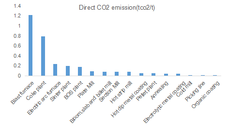 高炉-转炉炼钢(BF-BOF),其主要原材料包括铁矿石、焦煤(2751, 133.50, 5.10%)、焦炭(3450, 111.50, 3.34%)以及其他气体等,南华期货研究所认为在复杂的炼铁-炼钢过程中,碳排放量最大的环节是高炉炼铁环节,假如按照生产一吨钢的情况去算,高炉炼铁环节会产生1.026吨二氧化碳,其余环节,诸如锻造、压延等,碳排放量都小于1吨。