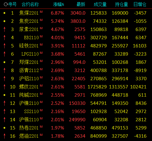 9月9日,期市早盘涨多跌少。焦煤(3040, 195.50, 6.87%)主力合约涨近7%,焦炭(3803, 206.50, 5.74%)涨近6%;苯乙烯、尿素涨超4%;硅铁(11112, 418.00, 3.91%)、液化石油气涨超3%。跌幅方面,玻璃(2530, -124.00, -4.67%)跌超4%,生猪、铁矿(727, -23.50, -3.13%)跌超3%。