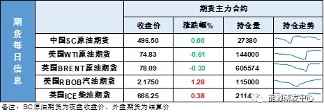 【1】WTI主力原油期货收跌0.46美元,跌幅0.61%,报74.83美元/桶;布伦特主力原油期货收跌0.26美元,跌幅0.33%,报78.09美元/桶;INE原油期货收跌0%,报496.5元。