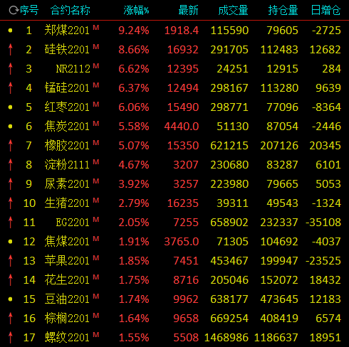 10月19日,期市早盘涨多跌少。动力煤(1918, 162.00, 9.23%)主力合约涨9.24%,硅铁(16932, 1350.00, 8.66%)涨逾8%,红枣(15490, 885.00, 6.06%)、锰硅(12494, 748.00, 6.37%)、20号胶涨逾6%,焦炭(4440, 234.50, 5.58%)、橡胶(15350, 740.00, 5.07%)涨逾5%,尿素涨逾3%;跌幅方面,燃油主力合约跌近4%,沥青(3190, -102.00, -3.10%)跌逾3%。
