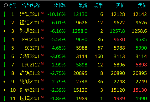 10月26日,国内期市早盘黑色系多数下跌,硅铁(12358, -1144.00, -8.47%)跌逾10%,锰硅(10044, -198.00, -1.93%)、动力煤(1255, -85.00, -6.34%)跌逾6%。