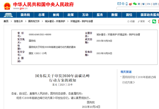 据中国政府网10月26日消息,国务院日前印发《2030年前碳达峰行动方案》。方案提到,到2025年,非化石能源消费比重达到20%左右,单位国内生产总值能源消耗比2020年下降13.5%,单位国内生产总值二氧化碳排放比2020年下降18%,为实现碳达峰奠定坚实基础。到2030年,非化石能源消费比重达到25%左右,单位国内生产总值二氧化碳排放比2005年下降65%以上,顺利实现2030年前碳达峰目标。