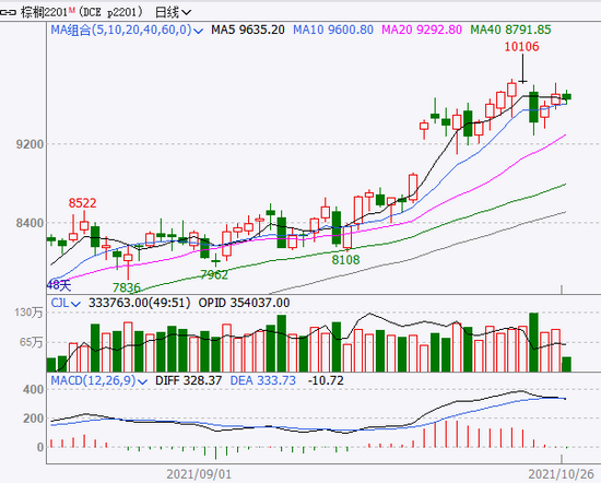 受原油、外盘豆油及棕榈(9648, -36.00, -0.37%)油价格连续上涨提振,国庆节后油脂板块不断上行,刷新年内高点。