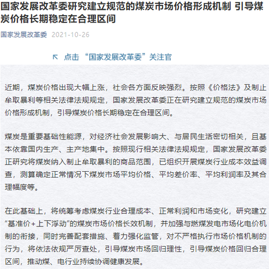 据国家发改委昨日消息,近期,煤炭价格出现大幅上涨,社会各方面反映强烈。按照《价格法》及制止牟取暴利等相关法律法规规定,国家发改委正在研究建立规范的煤炭市场价格形成机制,引导煤炭价格长期稳定在合理区间。